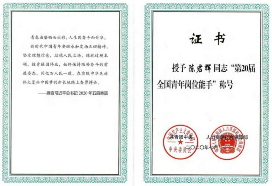 陈君辉获“全国技术能手称号”证书
