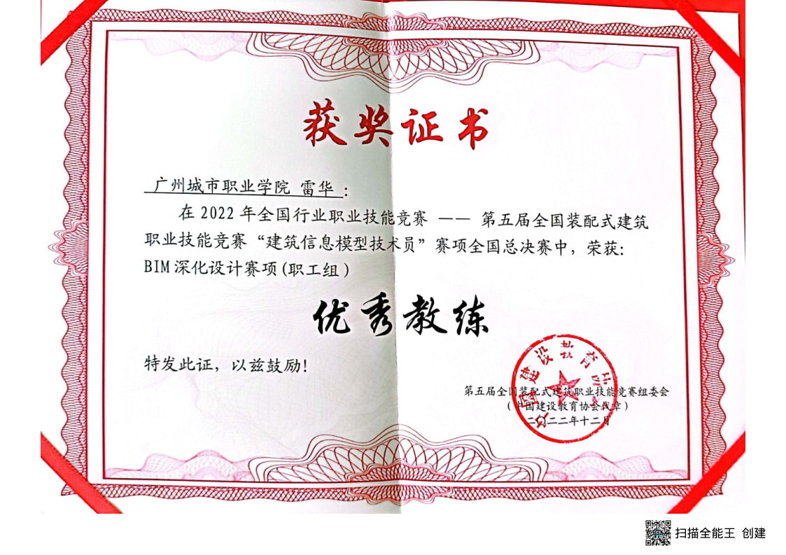 雷华获2022全国行业职业技能竞赛(第五届全国装配式建筑职业技能竞赛)优秀教练称号