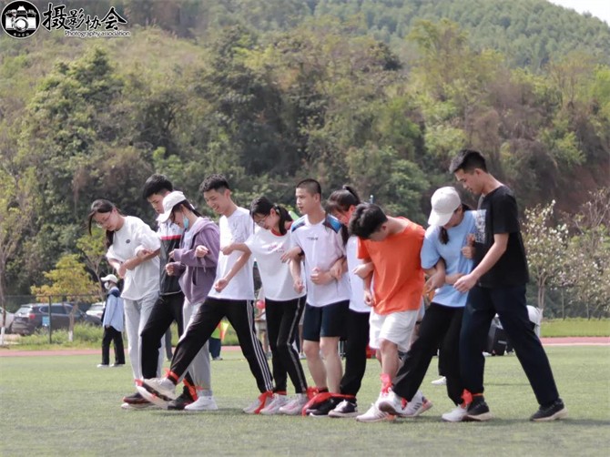 比赛规则:(1)抽签决定比赛次序。每队十人,叉排成一横排,相邻的人把腿系在一起,一起跑向终点。