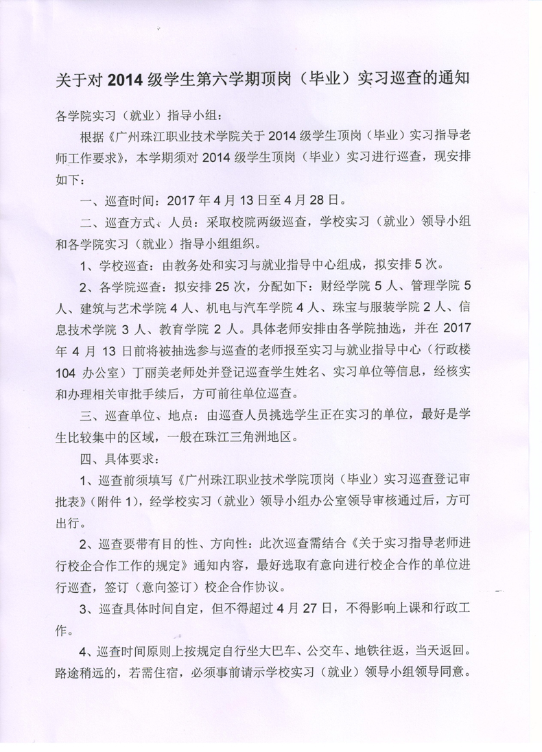 关于对2014级学生第六学期顶岗(毕业)实习巡查的通知