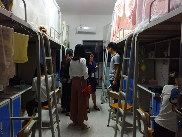 9号晚上,中医药学院老师和指导员到学生宿舍查看情况,表达对新生的关切。