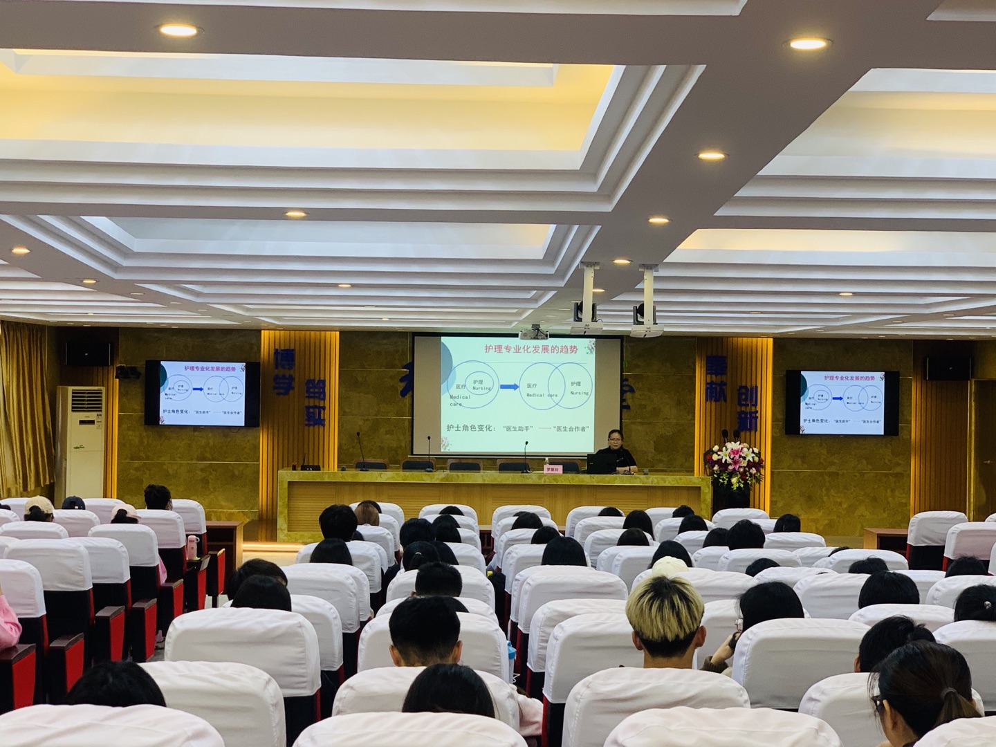 罗惠玲主任护师指出,随着社会的发展,护理实践内容的不断扩大,护理专业性不断提高,护理学从临床医学二级学科中分化出来,成为一级学科。护士也从“医生助手”转变为“医生合作者”。护理专业被教育部、卫计委等六部委列入国家紧缺人才专业,护理工作受到高度重视。护士列为医药卫生急需紧缺专门人才。尤其是目前我国人口老龄化,养老已是我国必须面对的重大社会问题,而且随着高龄化和健康慢病化的发展,老年健康照护和慢性病健康照护需要大量护理人员,未来护理人员将是养老和慢病健康照护的主力军,在老年健康和慢病健康中发挥重要的作用!在新冠疫情决战中急重症、呼吸等专科护理人员发挥了绝对的优势。她结合生命的意义引导思考选择护士职业的意义。引导学生用行动证明自己的能力与价值,告诫学生人生最大的挑战就是挑战自我。她提出护理专业可多方面发展,如临床护士、护理教育、护理管理、做科研、考卫生系统公务员、出国留学、进入国际医疗机构、育婴师、保健师、营养师、医药销售、心理咨询师、社区护士等等。希望同学们可以认真学好专业知识,提前做好职业规划。同学们认真聆听,认真记录。