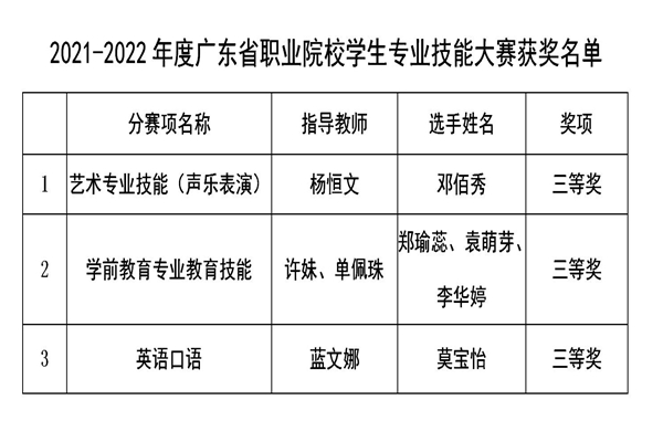 近日,广东省教育厅公布了2021-2022年度广东省职业院校学生专业技能大赛获奖名单,教育学院喜获三个奖项,分别为:杨恒文副教授指导邓佰秀同学参加声乐表演获得三等奖;许妹、单佩珠老师指导郑瑜蕊、袁萌芽、李华婷同学参加学前教育专业技能获得三等奖;蓝文娜老师指导莫宝怡同学参加英语口语获得三等奖。
