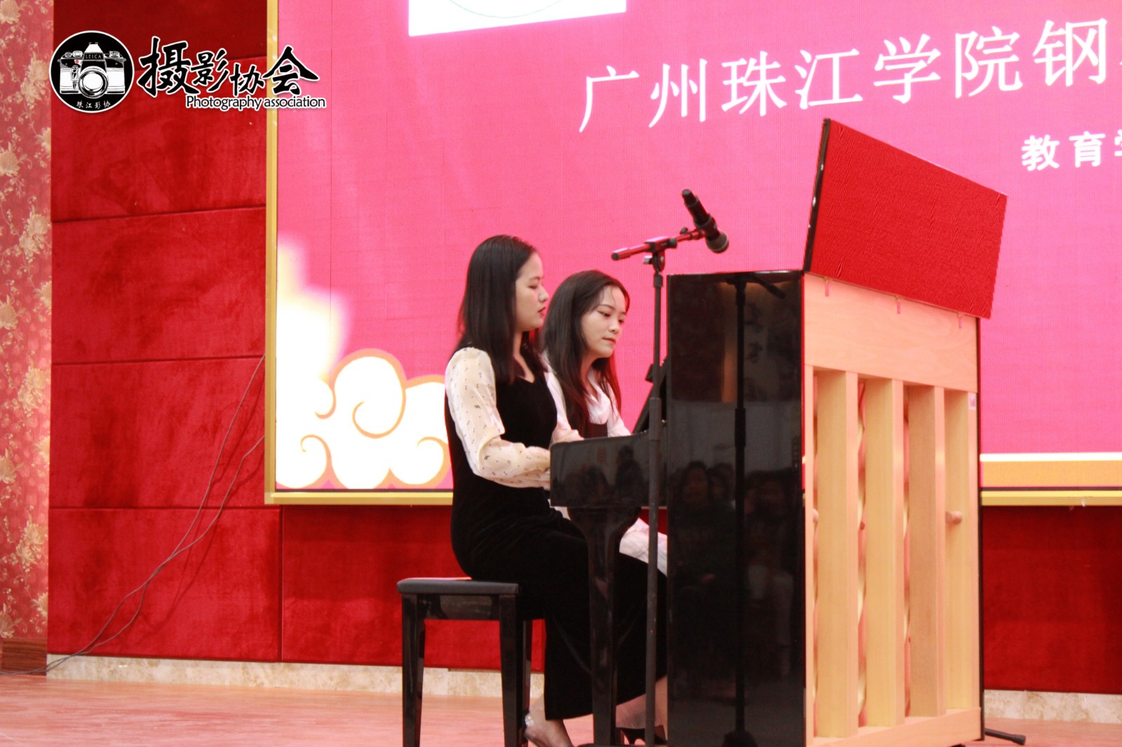 钢琴四手联弹表演形式的加入增加了音乐会的感染力。林丹如和陈霞荣两位同学合作演奏的四手联弹《草原小姐妹》默契十足,音乐主题明亮欢快,风格活泼清新。孙菁老师和林祖欣同学演奏的四手联弹曲目《云宫迅音》将音乐会推向高潮。最后由校合唱团演唱,孙菁老师伴奏的合唱曲目《启程》为本场音乐会划上了圆满的句号。