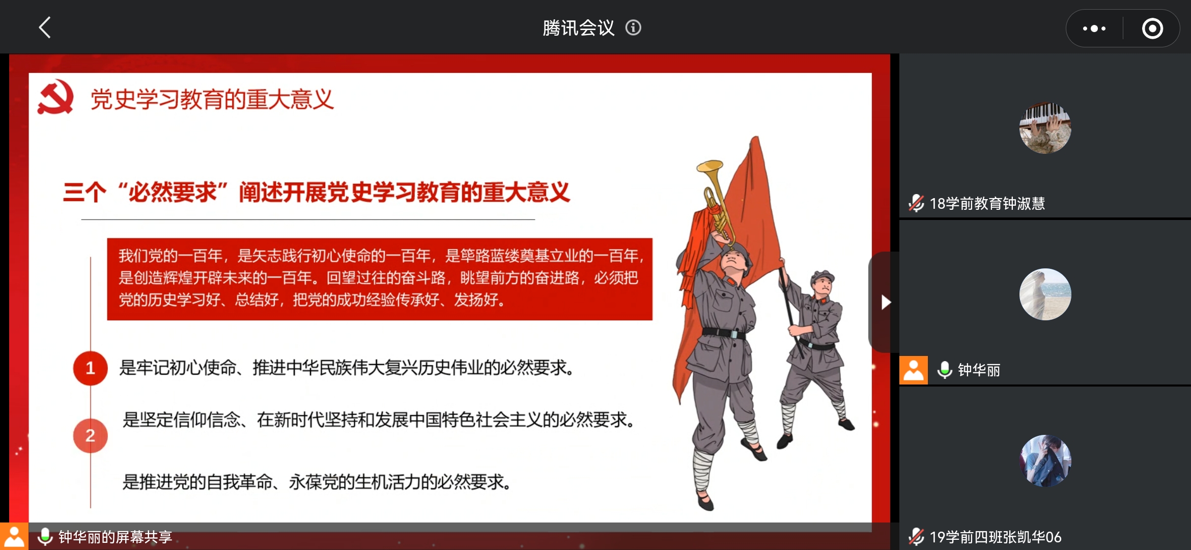 为深入学习贯彻习近平总书记在党史学习教育动员大会的重要讲话精神,深刻认识在全党开展党史学习教育的必要性与重要性,倡导全党同志做到学史明理、学史增信、学史崇德、学史力行,学党史、悟思想、办实事、开新局,以昂扬姿态奋力开启全面建设社会主义现代化国家新征程,按照校党委相关文件精神要求,2021年8月8日上午,教育学院学生党支部利用腾讯会议组织26期积极分子线上学习习近平总书记在党史学习教育动员大会的重要讲话精神,会议由学生党支部宣传委员钟华丽同志主持。