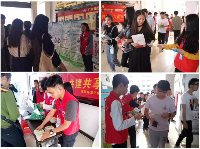 穿着抢眼的红色志愿者马甲的志愿者们,在校园内拉横幅、挂海报,手上拿着一沓沓的宣传单,派给每一位路过的老师和同学,并指引大家到宣传海报处观看详细的结核病预防知识。