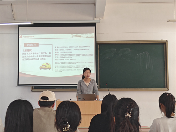 蒋卓珊老师在总结发言时说,希望同学通过此次新党章学习,按照党章的规定来严格要求自己,努力学习政治理论和业务知识,发扬和保持党员的先进性,提升个人的综合素质,争取早日成为一名合格的共产党员。