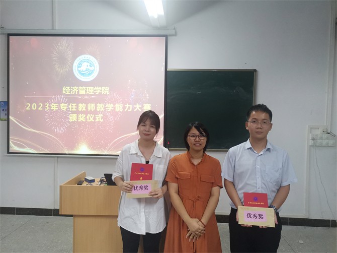 经过激烈角逐,电子商务专业汤紫婷老师夺得一等奖,法律事务专业曾祥瑞老师和刘玉莹老师荣获二等奖,大数据与会计专业何碧老师和电子商务专业丘雨苑老师获得三等奖。参加本次活动的领导和嘉宾为获奖老师颁发了荣誉证书和奖金,并合影留念。