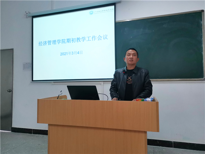 新学期,新面貌。2021年3月4日下午16:00时,经济管理学院在教学楼233多媒体教室召开新学期初教学工作会议,学院全体教职工参加了本次会议,会议由经济管理学院唐新国院长主持。